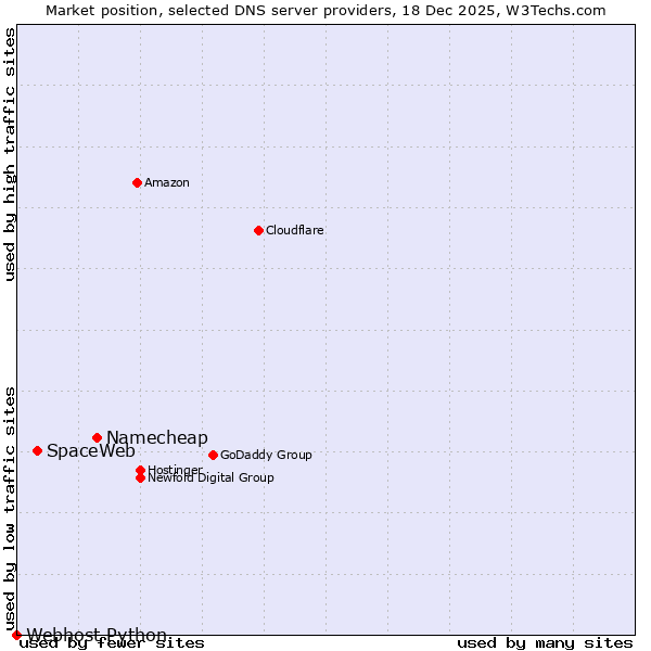 TechnologiesContent ManagementServer-side Languages Client-side Languages JavaScript Libraries CSS Frameworks Web Servers Web Panels Operating Systems Web Hosting Data Centers Reverse Proxies DNS Servers Email Servers SSL Certificate Authorities Content Delivery Traffic Analysis Tools Advertising Networks Tag Managers Social Widgets Site Elements Structured Data Markup Languages Character Encodings Image File Formats Top Level Domains Server Locations Content Languages | Technologies > DNS Servers > Technology usage comparison Comparison of the usage statistics of Namecheap vs. SpaceWeb vs. Webhost Python for websitesThis report shows the usage statistics of Namecheap vs. SpaceWeb vs. Webhost Python as DNS server provider on the web. See technologies overview for explanations on the methodologies used in the surveys. Our reports are updated daily. UsageThis diagram shows the percentages of websites using the selected technologies. How to read the diagram: