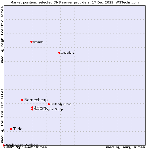 TechnologiesContent ManagementServer-side Languages Client-side Languages JavaScript Libraries CSS Frameworks Web Servers Web Panels Operating Systems Web Hosting Data Centers Reverse Proxies DNS Servers Email Servers SSL Certificate Authorities Content Delivery Traffic Analysis Tools Advertising Networks Tag Managers Social Widgets Site Elements Structured Data Markup Languages Character Encodings Image File Formats Top Level Domains Server Locations Content Languages | Technologies > DNS Servers > Technology usage comparison Comparison of the usage statistics of Namecheap vs. Tilda vs. Webhost Python for websitesThis report shows the usage statistics of Namecheap vs. Tilda vs. Webhost Python as DNS server provider on the web. See technologies overview for explanations on the methodologies used in the surveys. Our reports are updated daily. UsageThis diagram shows the percentages of websites using the selected technologies. How to read the diagram: