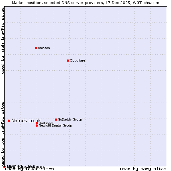 TechnologiesContent ManagementServer-side Languages Client-side Languages JavaScript Libraries CSS Frameworks Web Servers Web Panels Operating Systems Web Hosting Data Centers Reverse Proxies DNS Servers Email Servers SSL Certificate Authorities Content Delivery Traffic Analysis Tools Advertising Networks Tag Managers Social Widgets Site Elements Structured Data Markup Languages Character Encodings Image File Formats Top Level Domains Server Locations Content Languages | Technologies > DNS Servers > Technology usage comparison Comparison of the usage statistics of Names.co.uk vs. UPC Slovakia vs. Webhost Python for websitesThis report shows the usage statistics of Names.co.uk vs. UPC Slovakia vs. Webhost Python as DNS server provider on the web. See technologies overview for explanations on the methodologies used in the surveys. Our reports are updated daily. UsageThis diagram shows the percentages of websites using the selected technologies. How to read the diagram: