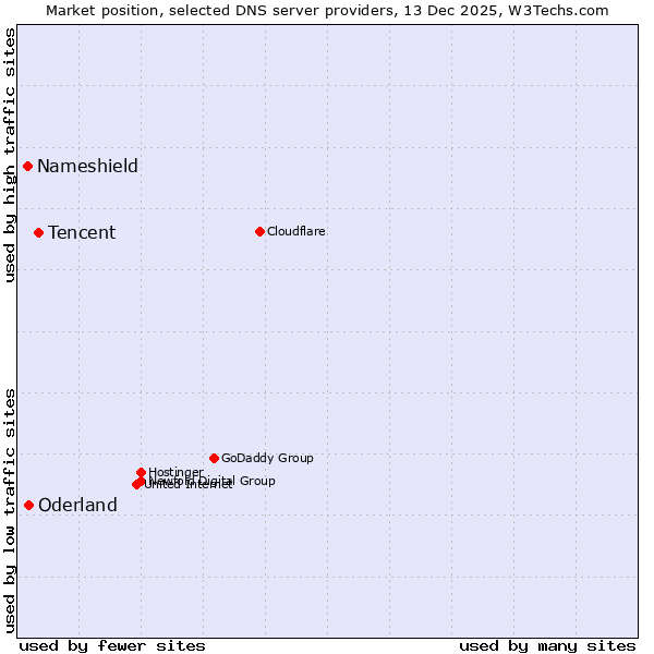 TechnologiesContent ManagementServer-side Languages Client-side Languages JavaScript Libraries CSS Frameworks Web Servers Web Panels Operating Systems Web Hosting Data Centers Reverse Proxies DNS Servers Email Servers SSL Certificate Authorities Content Delivery Traffic Analysis Tools Advertising Networks Tag Managers Social Widgets Site Elements Structured Data Markup Languages Character Encodings Image File Formats Top Level Domains Server Locations Content Languages | Technologies > DNS Servers > Technology usage comparison Comparison of the usage statistics of Tencent vs. Oderland vs. Nameshield for websitesThis report shows the usage statistics of Tencent vs. Oderland vs. Nameshield as DNS server provider on the web. See technologies overview for explanations on the methodologies used in the surveys. Our reports are updated daily. UsageThis diagram shows the percentages of websites using the selected technologies. How to read the diagram: