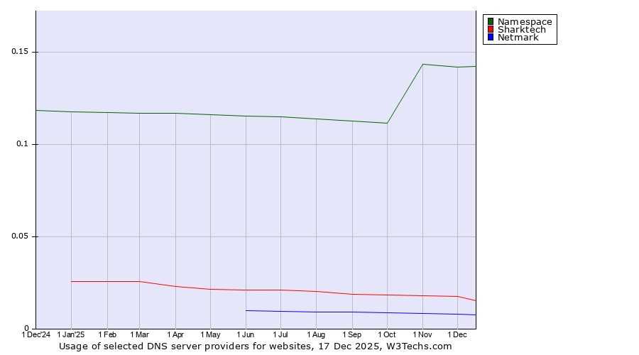 TechnologiesContent ManagementServer-side Languages Client-side Languages JavaScript Libraries CSS Frameworks Web Servers Web Panels Operating Systems Web Hosting Data Centers Reverse Proxies DNS Servers Email Servers SSL Certificate Authorities Content Delivery Traffic Analysis Tools Advertising Networks Tag Managers Social Widgets Site Elements Structured Data Markup Languages Character Encodings Image File Formats Top Level Domains Server Locations Content Languages | Technologies > DNS Servers > Technology usage comparison Comparison of the usage statistics of Namespace vs. Sharktech vs. Netmark for websitesThis report shows the usage statistics of Namespace vs. Sharktech vs. Netmark as DNS server provider on the web. See technologies overview for explanations on the methodologies used in the surveys. Our reports are updated daily. UsageThis diagram shows the percentages of websites using the selected technologies. How to read the diagram: