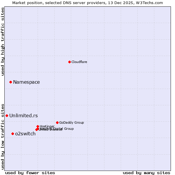 TechnologiesContent ManagementServer-side Languages Client-side Languages JavaScript Libraries CSS Frameworks Web Servers Web Panels Operating Systems Web Hosting Data Centers Reverse Proxies DNS Servers Email Servers SSL Certificate Authorities Content Delivery Traffic Analysis Tools Advertising Networks Tag Managers Social Widgets Site Elements Structured Data Markup Languages Character Encodings Image File Formats Top Level Domains Server Locations Content Languages | Technologies > DNS Servers > Technology usage comparison Comparison of the usage statistics of o2switch vs. Namespace vs. Unlimited.rs for websitesThis report shows the usage statistics of o2switch vs. Namespace vs. Unlimited.rs as DNS server provider on the web. See technologies overview for explanations on the methodologies used in the surveys. Our reports are updated daily. UsageThis diagram shows the percentages of websites using the selected technologies. How to read the diagram: