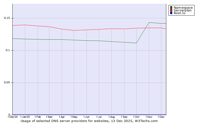 TechnologiesContent ManagementServer-side Languages Client-side Languages JavaScript Libraries CSS Frameworks Web Servers Web Panels Operating Systems Web Hosting Data Centers Reverse Proxies DNS Servers Email Servers SSL Certificate Authorities Content Delivery Traffic Analysis Tools Advertising Networks Tag Managers Social Widgets Site Elements Structured Data Markup Languages Character Encodings Image File Formats Top Level Domains Server Locations Content Languages | Technologies > DNS Servers > Technology usage comparison Comparison of the usage statistics of Namespace vs. Serverplan vs. Root.lu for websitesThis report shows the usage statistics of Namespace vs. Serverplan vs. Root.lu as DNS server provider on the web. See technologies overview for explanations on the methodologies used in the surveys. Our reports are updated daily. UsageThis diagram shows the percentages of websites using the selected technologies. How to read the diagram: