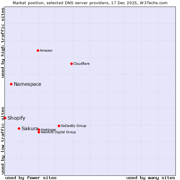 TechnologiesContent ManagementServer-side Languages Client-side Languages JavaScript Libraries CSS Frameworks Web Servers Web Panels Operating Systems Web Hosting Data Centers Reverse Proxies DNS Servers Email Servers SSL Certificate Authorities Content Delivery Traffic Analysis Tools Advertising Networks Tag Managers Social Widgets Site Elements Structured Data Markup Languages Character Encodings Image File Formats Top Level Domains Server Locations Content Languages | Technologies > DNS Servers > Technology usage comparison Comparison of the usage statistics of Sakura vs. Namespace vs. Shopify for websitesThis report shows the usage statistics of Sakura vs. Namespace vs. Shopify as DNS server provider on the web. See technologies overview for explanations on the methodologies used in the surveys. Our reports are updated daily. UsageThis diagram shows the percentages of websites using the selected technologies. How to read the diagram: