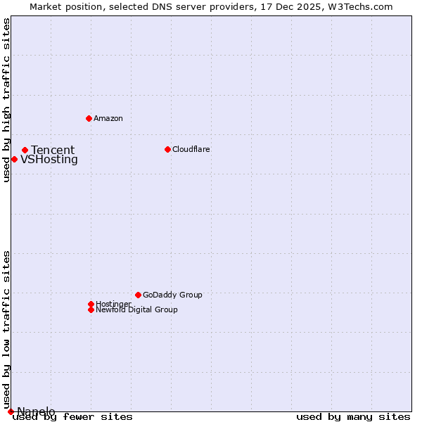 TechnologiesContent ManagementServer-side Languages Client-side Languages JavaScript Libraries CSS Frameworks Web Servers Web Panels Operating Systems Web Hosting Data Centers Reverse Proxies DNS Servers Email Servers SSL Certificate Authorities Content Delivery Traffic Analysis Tools Advertising Networks Tag Managers Social Widgets Site Elements Structured Data Markup Languages Character Encodings Image File Formats Top Level Domains Server Locations Content Languages | Technologies > DNS Servers > Technology usage comparison Comparison of the usage statistics of Tencent vs. VSHosting vs. Nanelo for websitesThis report shows the usage statistics of Tencent vs. VSHosting vs. Nanelo as DNS server provider on the web. See technologies overview for explanations on the methodologies used in the surveys. Our reports are updated daily. UsageThis diagram shows the percentages of websites using the selected technologies. How to read the diagram: