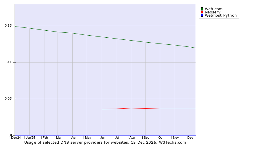 TechnologiesContent ManagementServer-side Languages Client-side Languages JavaScript Libraries CSS Frameworks Web Servers Web Panels Operating Systems Web Hosting Data Centers Reverse Proxies DNS Servers Email Servers SSL Certificate Authorities Content Delivery Traffic Analysis Tools Advertising Networks Tag Managers Social Widgets Site Elements Structured Data Markup Languages Character Encodings Image File Formats Top Level Domains Server Locations Content Languages | Technologies > DNS Servers > Technology usage comparison Comparison of the usage statistics of Web.com vs. Neoserv vs. Webhost Python for websitesThis report shows the usage statistics of Web.com vs. Neoserv vs. Webhost Python as DNS server provider on the web. See technologies overview for explanations on the methodologies used in the surveys. Our reports are updated daily. UsageThis diagram shows the percentages of websites using the selected technologies. How to read the diagram: