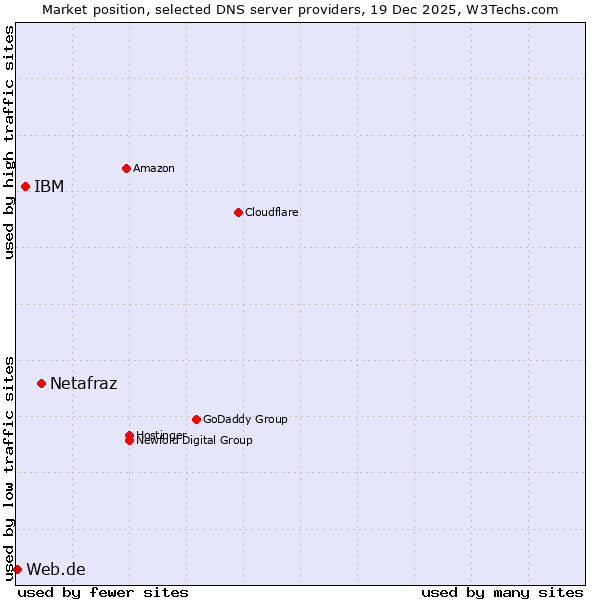 TechnologiesContent ManagementServer-side Languages Client-side Languages JavaScript Libraries CSS Frameworks Web Servers Web Panels Operating Systems Web Hosting Data Centers Reverse Proxies DNS Servers Email Servers SSL Certificate Authorities Content Delivery Traffic Analysis Tools Advertising Networks Tag Managers Social Widgets Site Elements Structured Data Markup Languages Character Encodings Image File Formats Top Level Domains Server Locations Content Languages | Technologies > DNS Servers > Technology usage comparison Comparison of the usage statistics of Netafraz vs. IBM vs. Web.de for websitesThis report shows the usage statistics of Netafraz vs. IBM vs. Web.de as DNS server provider on the web. See technologies overview for explanations on the methodologies used in the surveys. Our reports are updated daily. UsageThis diagram shows the percentages of websites using the selected technologies. How to read the diagram: