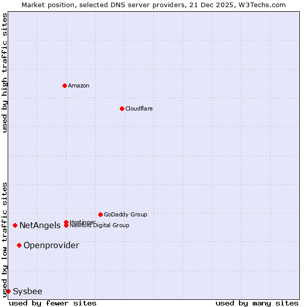 TechnologiesContent ManagementServer-side Languages Client-side Languages JavaScript Libraries CSS Frameworks Web Servers Web Panels Operating Systems Web Hosting Data Centers Reverse Proxies DNS Servers Email Servers SSL Certificate Authorities Content Delivery Traffic Analysis Tools Advertising Networks Tag Managers Social Widgets Site Elements Structured Data Markup Languages Character Encodings Image File Formats Top Level Domains Server Locations Content Languages | Technologies > DNS Servers > Technology usage comparison Comparison of the usage statistics of Openprovider vs. NetAngels vs. Sysbee for websitesThis report shows the usage statistics of Openprovider vs. NetAngels vs. Sysbee as DNS server provider on the web. See technologies overview for explanations on the methodologies used in the surveys. Our reports are updated daily. UsageThis diagram shows the percentages of websites using the selected technologies. How to read the diagram: