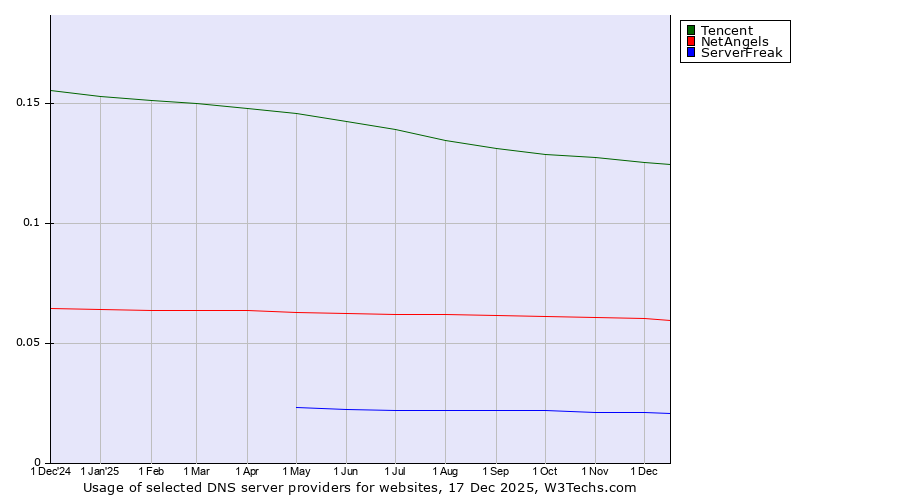 TechnologiesContent ManagementServer-side Languages Client-side Languages JavaScript Libraries CSS Frameworks Web Servers Web Panels Operating Systems Web Hosting Data Centers Reverse Proxies DNS Servers Email Servers SSL Certificate Authorities Content Delivery Traffic Analysis Tools Advertising Networks Tag Managers Social Widgets Site Elements Structured Data Markup Languages Character Encodings Image File Formats Top Level Domains Server Locations Content Languages | Technologies > DNS Servers > Technology usage comparison Comparison of the usage statistics of Tencent vs. NetAngels vs. ServerFreak for websitesThis report shows the usage statistics of Tencent vs. NetAngels vs. ServerFreak as DNS server provider on the web. See technologies overview for explanations on the methodologies used in the surveys. Our reports are updated daily. UsageThis diagram shows the percentages of websites using the selected technologies. How to read the diagram: