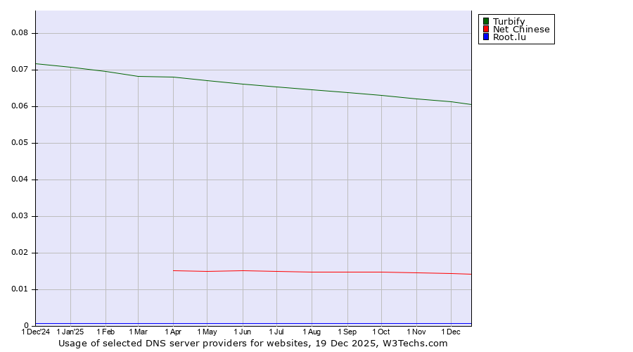 TechnologiesContent ManagementServer-side Languages Client-side Languages JavaScript Libraries CSS Frameworks Web Servers Web Panels Operating Systems Web Hosting Data Centers Reverse Proxies DNS Servers Email Servers SSL Certificate Authorities Content Delivery Traffic Analysis Tools Advertising Networks Tag Managers Social Widgets Site Elements Structured Data Markup Languages Character Encodings Image File Formats Top Level Domains Server Locations Content Languages | Technologies > DNS Servers > Technology usage comparison Comparison of the usage statistics of Turbify vs. Net Chinese vs. Root.lu for websitesThis report shows the usage statistics of Turbify vs. Net Chinese vs. Root.lu as DNS server provider on the web. See technologies overview for explanations on the methodologies used in the surveys. Our reports are updated daily. UsageThis diagram shows the percentages of websites using the selected technologies. How to read the diagram: