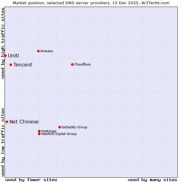 TechnologiesContent ManagementServer-side Languages Client-side Languages JavaScript Libraries CSS Frameworks Web Servers Web Panels Operating Systems Web Hosting Data Centers Reverse Proxies DNS Servers Email Servers SSL Certificate Authorities Content Delivery Traffic Analysis Tools Advertising Networks Tag Managers Social Widgets Site Elements Structured Data Markup Languages Character Encodings Image File Formats Top Level Domains Server Locations Content Languages | Technologies > DNS Servers > Technology usage comparison Comparison of the usage statistics of Tencent vs. Net Chinese vs. Uniti for websitesThis report shows the usage statistics of Tencent vs. Net Chinese vs. Uniti as DNS server provider on the web. See technologies overview for explanations on the methodologies used in the surveys. Our reports are updated daily. UsageThis diagram shows the percentages of websites using the selected technologies. How to read the diagram: