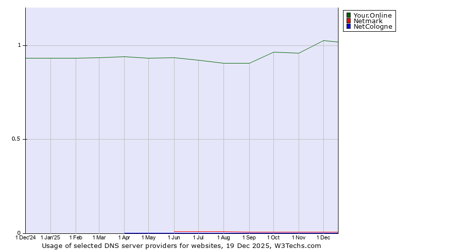 TechnologiesContent ManagementServer-side Languages Client-side Languages JavaScript Libraries CSS Frameworks Web Servers Web Panels Operating Systems Web Hosting Data Centers Reverse Proxies DNS Servers Email Servers SSL Certificate Authorities Content Delivery Traffic Analysis Tools Advertising Networks Tag Managers Social Widgets Site Elements Structured Data Markup Languages Character Encodings Image File Formats Top Level Domains Server Locations Content Languages | Technologies > DNS Servers > Technology usage comparison Comparison of the usage statistics of Your.Online vs. Netmark vs. NetCologne for websitesThis report shows the usage statistics of Your.Online vs. Netmark vs. NetCologne as DNS server provider on the web. See technologies overview for explanations on the methodologies used in the surveys. Our reports are updated daily. UsageThis diagram shows the percentages of websites using the selected technologies. How to read the diagram: