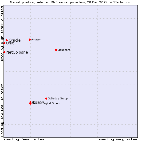 TechnologiesContent ManagementServer-side Languages Client-side Languages JavaScript Libraries CSS Frameworks Web Servers Web Panels Operating Systems Web Hosting Data Centers Reverse Proxies DNS Servers Email Servers SSL Certificate Authorities Content Delivery Traffic Analysis Tools Advertising Networks Tag Managers Social Widgets Site Elements Structured Data Markup Languages Character Encodings Image File Formats Top Level Domains Server Locations Content Languages | Technologies > DNS Servers > Technology usage comparison Comparison of the usage statistics of Oracle vs. NetCologne vs. Uniti for websitesThis report shows the usage statistics of Oracle vs. NetCologne vs. Uniti as DNS server provider on the web. See technologies overview for explanations on the methodologies used in the surveys. Our reports are updated daily. UsageThis diagram shows the percentages of websites using the selected technologies. How to read the diagram: