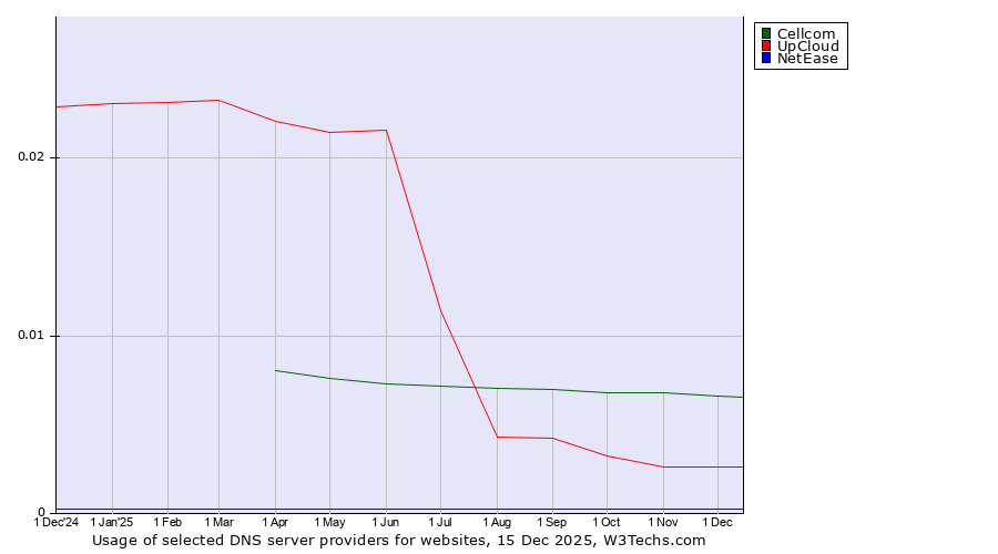 TechnologiesContent ManagementServer-side Languages Client-side Languages JavaScript Libraries CSS Frameworks Web Servers Web Panels Operating Systems Web Hosting Data Centers Reverse Proxies DNS Servers Email Servers SSL Certificate Authorities Content Delivery Traffic Analysis Tools Advertising Networks Tag Managers Social Widgets Site Elements Structured Data Markup Languages Character Encodings Image File Formats Top Level Domains Server Locations Content Languages | Technologies > DNS Servers > Technology usage comparison Comparison of the usage statistics of Cellcom vs. UpCloud vs. NetEase for websitesThis report shows the usage statistics of Cellcom vs. UpCloud vs. NetEase as DNS server provider on the web. See technologies overview for explanations on the methodologies used in the surveys. Our reports are updated daily. UsageThis diagram shows the percentages of websites using the selected technologies. How to read the diagram:
