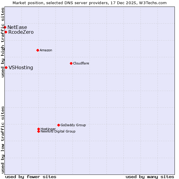 TechnologiesContent ManagementServer-side Languages Client-side Languages JavaScript Libraries CSS Frameworks Web Servers Web Panels Operating Systems Web Hosting Data Centers Reverse Proxies DNS Servers Email Servers SSL Certificate Authorities Content Delivery Traffic Analysis Tools Advertising Networks Tag Managers Social Widgets Site Elements Structured Data Markup Languages Character Encodings Image File Formats Top Level Domains Server Locations Content Languages | Technologies > DNS Servers > Technology usage comparison Comparison of the usage statistics of VSHosting vs. RcodeZero vs. NetEase for websitesThis report shows the usage statistics of VSHosting vs. RcodeZero vs. NetEase as DNS server provider on the web. See technologies overview for explanations on the methodologies used in the surveys. Our reports are updated daily. UsageThis diagram shows the percentages of websites using the selected technologies. How to read the diagram: