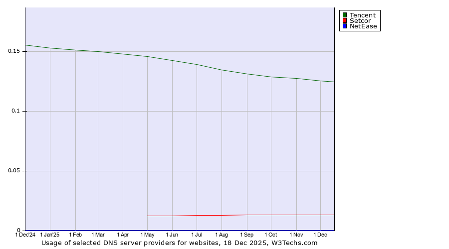 TechnologiesContent ManagementServer-side Languages Client-side Languages JavaScript Libraries CSS Frameworks Web Servers Web Panels Operating Systems Web Hosting Data Centers Reverse Proxies DNS Servers Email Servers SSL Certificate Authorities Content Delivery Traffic Analysis Tools Advertising Networks Tag Managers Social Widgets Site Elements Structured Data Markup Languages Character Encodings Image File Formats Top Level Domains Server Locations Content Languages | Technologies > DNS Servers > Technology usage comparison Comparison of the usage statistics of Tencent vs. Setcor vs. NetEase for websitesThis report shows the usage statistics of Tencent vs. Setcor vs. NetEase as DNS server provider on the web. See technologies overview for explanations on the methodologies used in the surveys. Our reports are updated daily. UsageThis diagram shows the percentages of websites using the selected technologies. How to read the diagram: