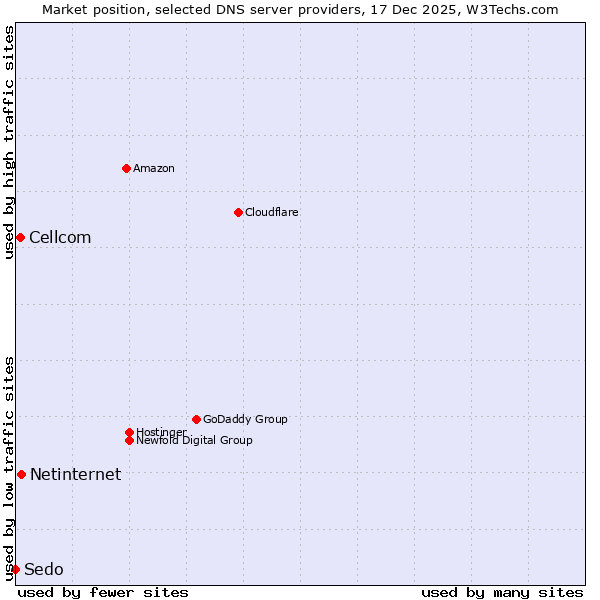 TechnologiesContent ManagementServer-side Languages Client-side Languages JavaScript Libraries CSS Frameworks Web Servers Web Panels Operating Systems Web Hosting Data Centers Reverse Proxies DNS Servers Email Servers SSL Certificate Authorities Content Delivery Traffic Analysis Tools Advertising Networks Tag Managers Social Widgets Site Elements Structured Data Markup Languages Character Encodings Image File Formats Top Level Domains Server Locations Content Languages | Technologies > DNS Servers > Technology usage comparison Comparison of the usage statistics of Netinternet vs. Cellcom vs. Sedo for websitesThis report shows the usage statistics of Netinternet vs. Cellcom vs. Sedo as DNS server provider on the web. See technologies overview for explanations on the methodologies used in the surveys. Our reports are updated daily. UsageThis diagram shows the percentages of websites using the selected technologies. How to read the diagram: