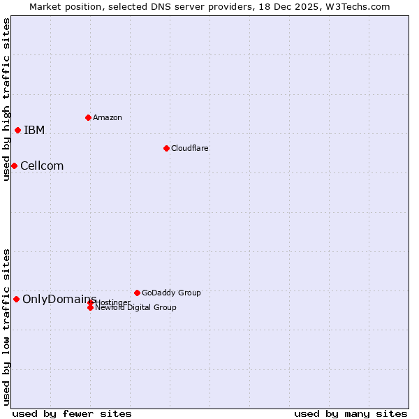 TechnologiesContent ManagementServer-side Languages Client-side Languages JavaScript Libraries CSS Frameworks Web Servers Web Panels Operating Systems Web Hosting Data Centers Reverse Proxies DNS Servers Email Servers SSL Certificate Authorities Content Delivery Traffic Analysis Tools Advertising Networks Tag Managers Social Widgets Site Elements Structured Data Markup Languages Character Encodings Image File Formats Top Level Domains Server Locations Content Languages | Technologies > DNS Servers > Technology usage comparison Comparison of the usage statistics of IBM vs. OnlyDomains vs. Cellcom for websitesThis report shows the usage statistics of IBM vs. OnlyDomains vs. Cellcom as DNS server provider on the web. See technologies overview for explanations on the methodologies used in the surveys. Our reports are updated daily. UsageThis diagram shows the percentages of websites using the selected technologies. How to read the diagram: