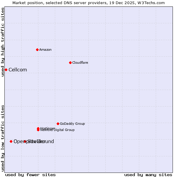 TechnologiesContent ManagementServer-side Languages Client-side Languages JavaScript Libraries CSS Frameworks Web Servers Web Panels Operating Systems Web Hosting Data Centers Reverse Proxies DNS Servers Email Servers SSL Certificate Authorities Content Delivery Traffic Analysis Tools Advertising Networks Tag Managers Social Widgets Site Elements Structured Data Markup Languages Character Encodings Image File Formats Top Level Domains Server Locations Content Languages | Technologies > DNS Servers > Technology usage comparison Comparison of the usage statistics of SiteGround vs. Openprovider vs. Cellcom for websitesThis report shows the usage statistics of SiteGround vs. Openprovider vs. Cellcom as DNS server provider on the web. See technologies overview for explanations on the methodologies used in the surveys. Our reports are updated daily. UsageThis diagram shows the percentages of websites using the selected technologies. How to read the diagram: