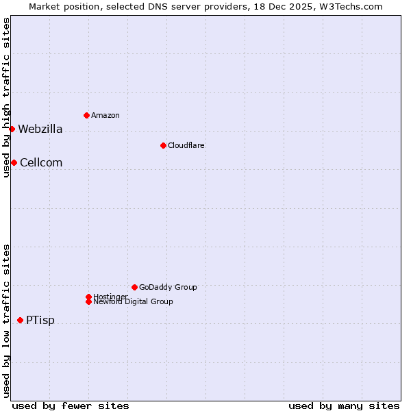 TechnologiesContent ManagementServer-side Languages Client-side Languages JavaScript Libraries CSS Frameworks Web Servers Web Panels Operating Systems Web Hosting Data Centers Reverse Proxies DNS Servers Email Servers SSL Certificate Authorities Content Delivery Traffic Analysis Tools Advertising Networks Tag Managers Social Widgets Site Elements Structured Data Markup Languages Character Encodings Image File Formats Top Level Domains Server Locations Content Languages | Technologies > DNS Servers > Technology usage comparison Comparison of the usage statistics of PTisp vs. Cellcom vs. Webzilla for websitesThis report shows the usage statistics of PTisp vs. Cellcom vs. Webzilla as DNS server provider on the web. See technologies overview for explanations on the methodologies used in the surveys. Our reports are updated daily. UsageThis diagram shows the percentages of websites using the selected technologies. How to read the diagram: