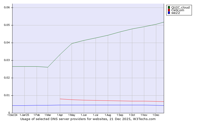 TechnologiesContent ManagementServer-side Languages Client-side Languages JavaScript Libraries CSS Frameworks Web Servers Web Panels Operating Systems Web Hosting Data Centers Reverse Proxies DNS Servers Email Servers SSL Certificate Authorities Content Delivery Traffic Analysis Tools Advertising Networks Tag Managers Social Widgets Site Elements Structured Data Markup Languages Character Encodings Image File Formats Top Level Domains Server Locations Content Languages | Technologies > DNS Servers > Technology usage comparison Comparison of the usage statistics of QUIC.cloud vs. Cellcom vs. we22 for websitesThis report shows the usage statistics of QUIC.cloud vs. Cellcom vs. we22 as DNS server provider on the web. See technologies overview for explanations on the methodologies used in the surveys. Our reports are updated daily. UsageThis diagram shows the percentages of websites using the selected technologies. How to read the diagram: