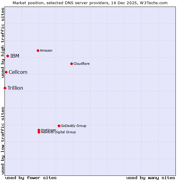 TechnologiesContent ManagementServer-side Languages Client-side Languages JavaScript Libraries CSS Frameworks Web Servers Web Panels Operating Systems Web Hosting Data Centers Reverse Proxies DNS Servers Email Servers SSL Certificate Authorities Content Delivery Traffic Analysis Tools Advertising Networks Tag Managers Social Widgets Site Elements Structured Data Markup Languages Character Encodings Image File Formats Top Level Domains Server Locations Content Languages | Technologies > DNS Servers > Technology usage comparison Comparison of the usage statistics of IBM vs. Cellcom vs. Trillion for websitesThis report shows the usage statistics of IBM vs. Cellcom vs. Trillion as DNS server provider on the web. See technologies overview for explanations on the methodologies used in the surveys. Our reports are updated daily. UsageThis diagram shows the percentages of websites using the selected technologies. How to read the diagram: