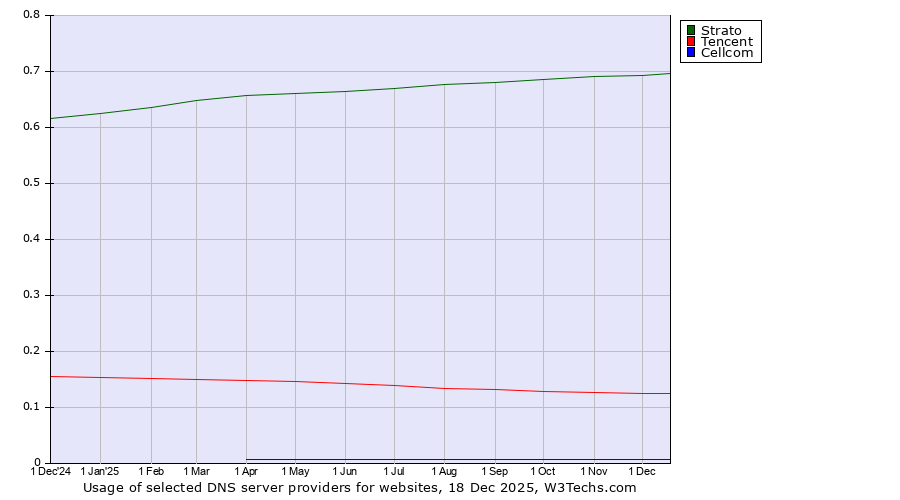 TechnologiesContent ManagementServer-side Languages Client-side Languages JavaScript Libraries CSS Frameworks Web Servers Web Panels Operating Systems Web Hosting Data Centers Reverse Proxies DNS Servers Email Servers SSL Certificate Authorities Content Delivery Traffic Analysis Tools Advertising Networks Tag Managers Social Widgets Site Elements Structured Data Markup Languages Character Encodings Image File Formats Top Level Domains Server Locations Content Languages | Technologies > DNS Servers > Technology usage comparison Comparison of the usage statistics of Strato vs. Tencent vs. Cellcom for websitesThis report shows the usage statistics of Strato vs. Tencent vs. Cellcom as DNS server provider on the web. See technologies overview for explanations on the methodologies used in the surveys. Our reports are updated daily. UsageThis diagram shows the percentages of websites using the selected technologies. How to read the diagram: