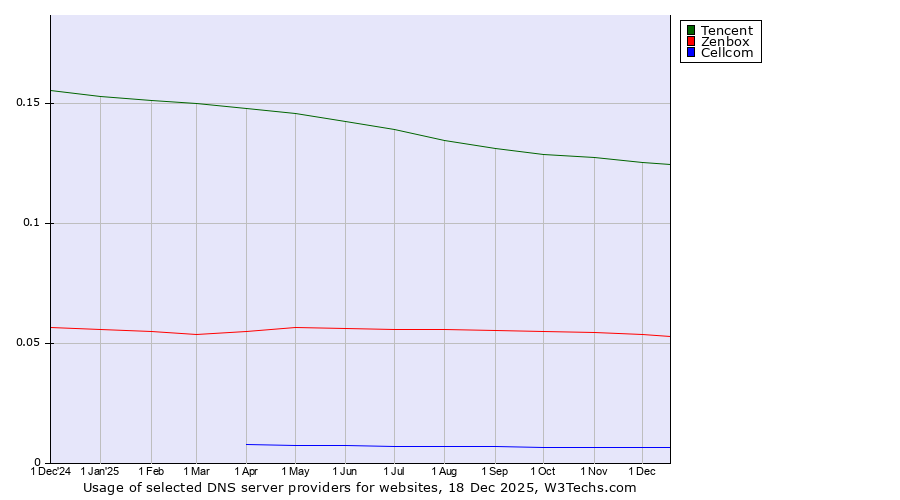TechnologiesContent ManagementServer-side Languages Client-side Languages JavaScript Libraries CSS Frameworks Web Servers Web Panels Operating Systems Web Hosting Data Centers Reverse Proxies DNS Servers Email Servers SSL Certificate Authorities Content Delivery Traffic Analysis Tools Advertising Networks Tag Managers Social Widgets Site Elements Structured Data Markup Languages Character Encodings Image File Formats Top Level Domains Server Locations Content Languages | Technologies > DNS Servers > Technology usage comparison Comparison of the usage statistics of Tencent vs. Zenbox vs. Cellcom for websitesThis report shows the usage statistics of Tencent vs. Zenbox vs. Cellcom as DNS server provider on the web. See technologies overview for explanations on the methodologies used in the surveys. Our reports are updated daily. UsageThis diagram shows the percentages of websites using the selected technologies. How to read the diagram: