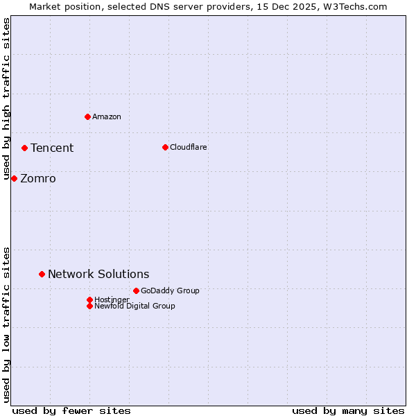 TechnologiesContent ManagementServer-side Languages Client-side Languages JavaScript Libraries CSS Frameworks Web Servers Web Panels Operating Systems Web Hosting Data Centers Reverse Proxies DNS Servers Email Servers SSL Certificate Authorities Content Delivery Traffic Analysis Tools Advertising Networks Tag Managers Social Widgets Site Elements Structured Data Markup Languages Character Encodings Image File Formats Top Level Domains Server Locations Content Languages | Technologies > DNS Servers > Technology usage comparison Comparison of the usage statistics of Network Solutions vs. Tencent vs. Zomro for websitesThis report shows the usage statistics of Network Solutions vs. Tencent vs. Zomro as DNS server provider on the web. See technologies overview for explanations on the methodologies used in the surveys. Our reports are updated daily. UsageThis diagram shows the percentages of websites using the selected technologies. How to read the diagram: