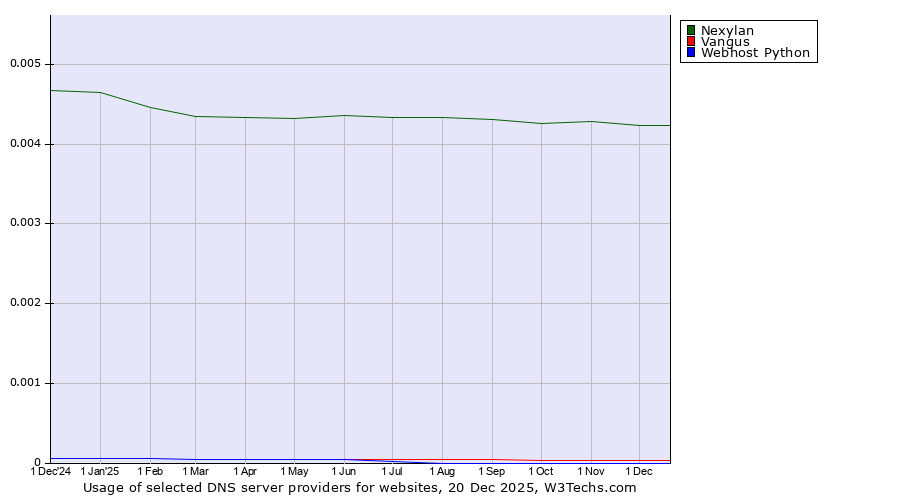 TechnologiesContent ManagementServer-side Languages Client-side Languages JavaScript Libraries CSS Frameworks Web Servers Web Panels Operating Systems Web Hosting Data Centers Reverse Proxies DNS Servers Email Servers SSL Certificate Authorities Content Delivery Traffic Analysis Tools Advertising Networks Tag Managers Social Widgets Site Elements Structured Data Markup Languages Character Encodings Image File Formats Top Level Domains Server Locations Content Languages | Technologies > DNS Servers > Technology usage comparison Comparison of the usage statistics of Nexylan vs. Vangus vs. Webhost Python for websitesThis report shows the usage statistics of Nexylan vs. Vangus vs. Webhost Python as DNS server provider on the web. See technologies overview for explanations on the methodologies used in the surveys. Our reports are updated daily. UsageThis diagram shows the percentages of websites using the selected technologies. How to read the diagram: