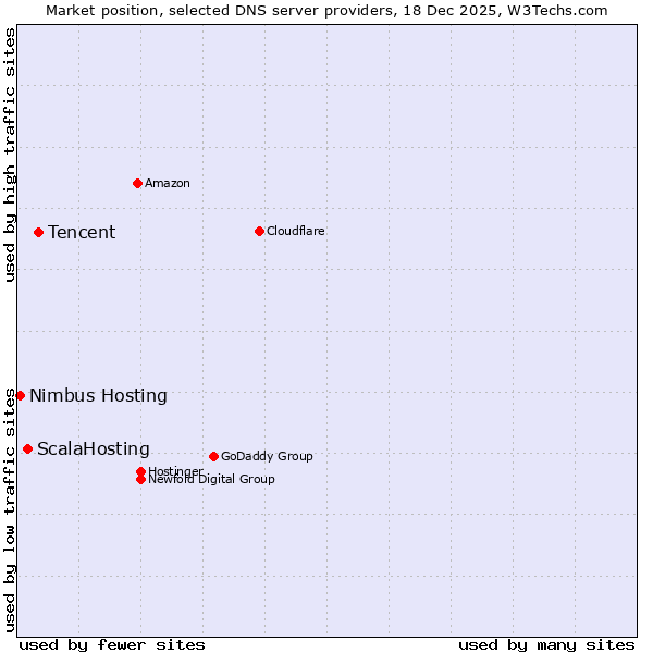 TechnologiesContent ManagementServer-side Languages Client-side Languages JavaScript Libraries CSS Frameworks Web Servers Web Panels Operating Systems Web Hosting Data Centers Reverse Proxies DNS Servers Email Servers SSL Certificate Authorities Content Delivery Traffic Analysis Tools Advertising Networks Tag Managers Social Widgets Site Elements Structured Data Markup Languages Character Encodings Image File Formats Top Level Domains Server Locations Content Languages | Technologies > DNS Servers > Technology usage comparison Comparison of the usage statistics of Tencent vs. ScalaHosting vs. Nimbus Hosting for websitesThis report shows the usage statistics of Tencent vs. ScalaHosting vs. Nimbus Hosting as DNS server provider on the web. See technologies overview for explanations on the methodologies used in the surveys. Our reports are updated daily. UsageThis diagram shows the percentages of websites using the selected technologies. How to read the diagram: