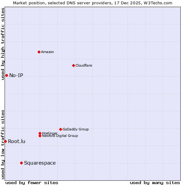 TechnologiesContent ManagementServer-side Languages Client-side Languages JavaScript Libraries CSS Frameworks Web Servers Web Panels Operating Systems Web Hosting Data Centers Reverse Proxies DNS Servers Email Servers SSL Certificate Authorities Content Delivery Traffic Analysis Tools Advertising Networks Tag Managers Social Widgets Site Elements Structured Data Markup Languages Character Encodings Image File Formats Top Level Domains Server Locations Content Languages | Technologies > DNS Servers > Technology usage comparison Comparison of the usage statistics of Squarespace vs. No-IP vs. Root.lu for websitesThis report shows the usage statistics of Squarespace vs. No-IP vs. Root.lu as DNS server provider on the web. See technologies overview for explanations on the methodologies used in the surveys. Our reports are updated daily. UsageThis diagram shows the percentages of websites using the selected technologies. How to read the diagram: