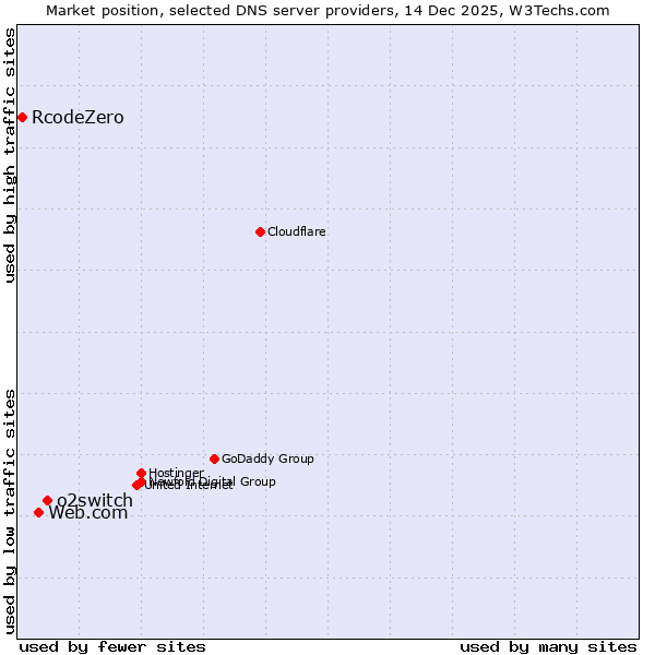 TechnologiesContent ManagementServer-side Languages Client-side Languages JavaScript Libraries CSS Frameworks Web Servers Web Panels Operating Systems Web Hosting Data Centers Reverse Proxies DNS Servers Email Servers SSL Certificate Authorities Content Delivery Traffic Analysis Tools Advertising Networks Tag Managers Social Widgets Site Elements Structured Data Markup Languages Character Encodings Image File Formats Top Level Domains Server Locations Content Languages | Technologies > DNS Servers > Technology usage comparison Comparison of the usage statistics of o2switch vs. Web.com vs. RcodeZero for websitesThis report shows the usage statistics of o2switch vs. Web.com vs. RcodeZero as DNS server provider on the web. See technologies overview for explanations on the methodologies used in the surveys. Our reports are updated daily. UsageThis diagram shows the percentages of websites using the selected technologies. How to read the diagram: