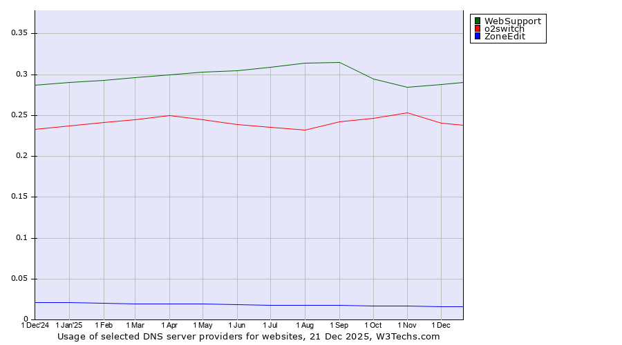 TechnologiesContent ManagementServer-side Languages Client-side Languages JavaScript Libraries CSS Frameworks Web Servers Web Panels Operating Systems Web Hosting Data Centers Reverse Proxies DNS Servers Email Servers SSL Certificate Authorities Content Delivery Traffic Analysis Tools Advertising Networks Tag Managers Social Widgets Site Elements Structured Data Markup Languages Character Encodings Image File Formats Top Level Domains Server Locations Content Languages | Technologies > DNS Servers > Technology usage comparison Comparison of the usage statistics of WebSupport vs. o2switch vs. ZoneEdit for websitesThis report shows the usage statistics of WebSupport vs. o2switch vs. ZoneEdit as DNS server provider on the web. See technologies overview for explanations on the methodologies used in the surveys. Our reports are updated daily. UsageThis diagram shows the percentages of websites using the selected technologies. How to read the diagram: