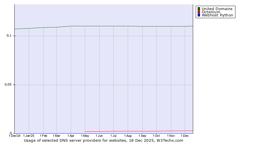 TechnologiesContent ManagementServer-side Languages Client-side Languages JavaScript Libraries CSS Frameworks Web Servers Web Panels Operating Systems Web Hosting Data Centers Reverse Proxies DNS Servers Email Servers SSL Certificate Authorities Content Delivery Traffic Analysis Tools Advertising Networks Tag Managers Social Widgets Site Elements Structured Data Markup Languages Character Encodings Image File Formats Top Level Domains Server Locations Content Languages | Technologies > DNS Servers > Technology usage comparison Comparison of the usage statistics of United Domains vs. Octenium vs. Webhost Python for websitesThis report shows the usage statistics of United Domains vs. Octenium vs. Webhost Python as DNS server provider on the web. See technologies overview for explanations on the methodologies used in the surveys. Our reports are updated daily. UsageThis diagram shows the percentages of websites using the selected technologies. How to read the diagram: