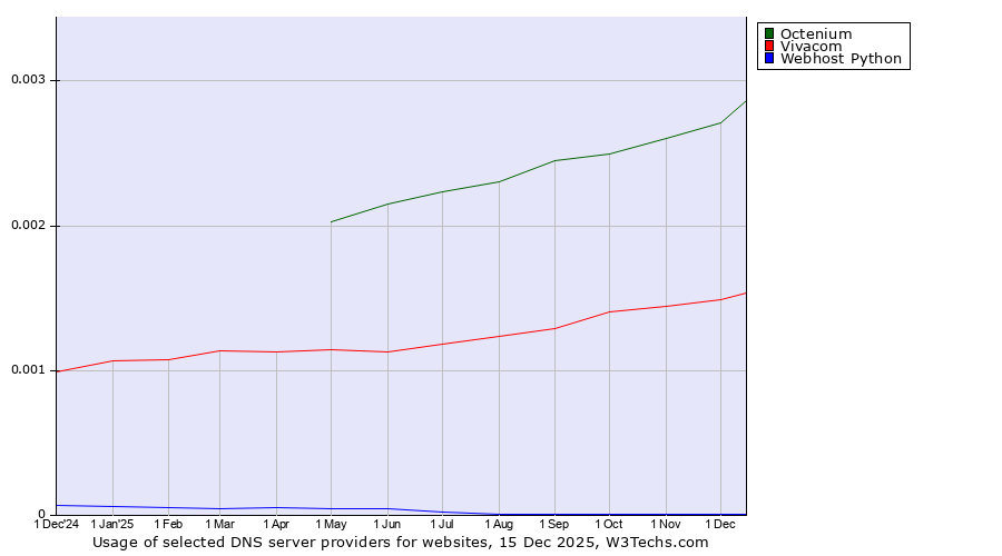 TechnologiesContent ManagementServer-side Languages Client-side Languages JavaScript Libraries CSS Frameworks Web Servers Web Panels Operating Systems Web Hosting Data Centers Reverse Proxies DNS Servers Email Servers SSL Certificate Authorities Content Delivery Traffic Analysis Tools Advertising Networks Tag Managers Social Widgets Site Elements Structured Data Markup Languages Character Encodings Image File Formats Top Level Domains Server Locations Content Languages | Technologies > DNS Servers > Technology usage comparison Comparison of the usage statistics of Octenium vs. Vivacom vs. Webhost Python for websitesThis report shows the usage statistics of Octenium vs. Vivacom vs. Webhost Python as DNS server provider on the web. See technologies overview for explanations on the methodologies used in the surveys. Our reports are updated daily. UsageThis diagram shows the percentages of websites using the selected technologies. How to read the diagram: