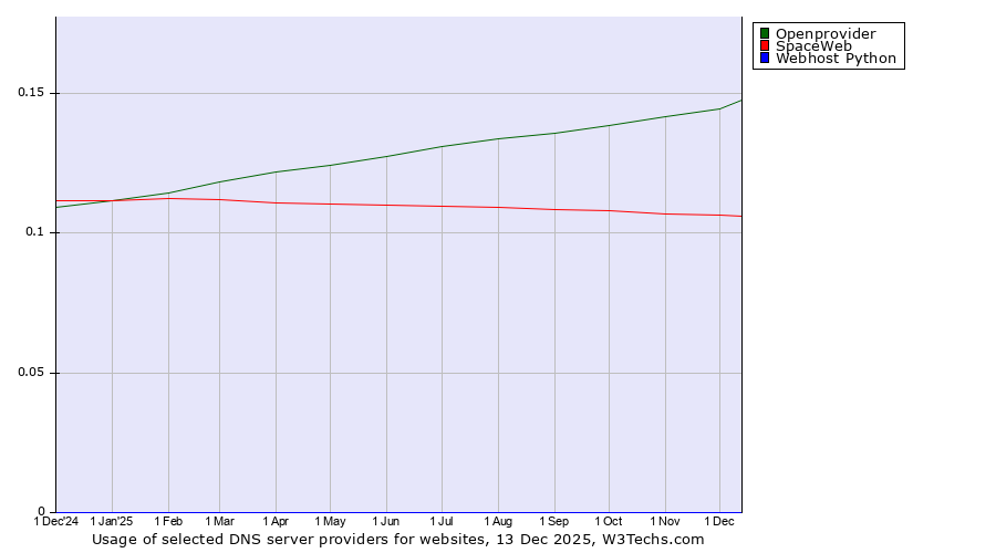 TechnologiesContent ManagementServer-side Languages Client-side Languages JavaScript Libraries CSS Frameworks Web Servers Web Panels Operating Systems Web Hosting Data Centers Reverse Proxies DNS Servers Email Servers SSL Certificate Authorities Content Delivery Traffic Analysis Tools Advertising Networks Tag Managers Social Widgets Site Elements Structured Data Markup Languages Character Encodings Image File Formats Top Level Domains Server Locations Content Languages | Technologies > DNS Servers > Technology usage comparison Comparison of the usage statistics of Openprovider vs. SpaceWeb vs. Webhost Python for websitesThis report shows the usage statistics of Openprovider vs. SpaceWeb vs. Webhost Python as DNS server provider on the web. See technologies overview for explanations on the methodologies used in the surveys. Our reports are updated daily. UsageThis diagram shows the percentages of websites using the selected technologies. How to read the diagram: