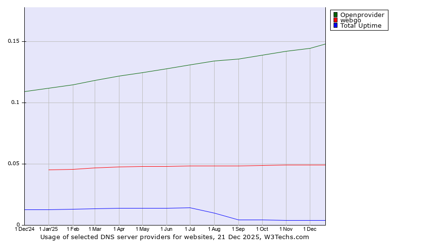 TechnologiesContent ManagementServer-side Languages Client-side Languages JavaScript Libraries CSS Frameworks Web Servers Web Panels Operating Systems Web Hosting Data Centers Reverse Proxies DNS Servers Email Servers SSL Certificate Authorities Content Delivery Traffic Analysis Tools Advertising Networks Tag Managers Social Widgets Site Elements Structured Data Markup Languages Character Encodings Image File Formats Top Level Domains Server Locations Content Languages | Technologies > DNS Servers > Technology usage comparison Comparison of the usage statistics of Openprovider vs. webgo vs. Total Uptime for websitesThis report shows the usage statistics of Openprovider vs. webgo vs. Total Uptime as DNS server provider on the web. See technologies overview for explanations on the methodologies used in the surveys. Our reports are updated daily. UsageThis diagram shows the percentages of websites using the selected technologies. How to read the diagram: