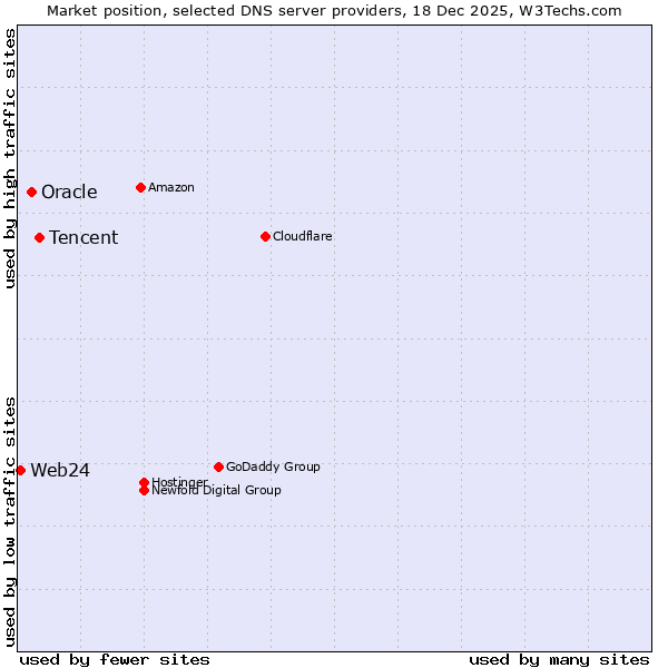 TechnologiesContent ManagementServer-side Languages Client-side Languages JavaScript Libraries CSS Frameworks Web Servers Web Panels Operating Systems Web Hosting Data Centers Reverse Proxies DNS Servers Email Servers SSL Certificate Authorities Content Delivery Traffic Analysis Tools Advertising Networks Tag Managers Social Widgets Site Elements Structured Data Markup Languages Character Encodings Image File Formats Top Level Domains Server Locations Content Languages | Technologies > DNS Servers > Technology usage comparison Comparison of the usage statistics of Tencent vs. Oracle vs. Web24 for websitesThis report shows the usage statistics of Tencent vs. Oracle vs. Web24 as DNS server provider on the web. See technologies overview for explanations on the methodologies used in the surveys. Our reports are updated daily. UsageThis diagram shows the percentages of websites using the selected technologies. How to read the diagram: