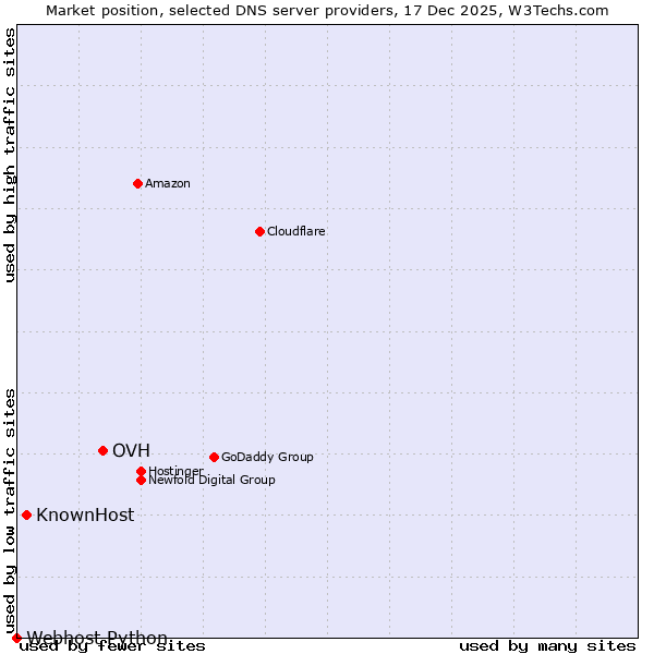 TechnologiesContent ManagementServer-side Languages Client-side Languages JavaScript Libraries CSS Frameworks Web Servers Web Panels Operating Systems Web Hosting Data Centers Reverse Proxies DNS Servers Email Servers SSL Certificate Authorities Content Delivery Traffic Analysis Tools Advertising Networks Tag Managers Social Widgets Site Elements Structured Data Markup Languages Character Encodings Image File Formats Top Level Domains Server Locations Content Languages | Technologies > DNS Servers > Technology usage comparison Comparison of the usage statistics of OVH vs. KnownHost vs. Webhost Python for websitesThis report shows the usage statistics of OVH vs. KnownHost vs. Webhost Python as DNS server provider on the web. See technologies overview for explanations on the methodologies used in the surveys. Our reports are updated daily. UsageThis diagram shows the percentages of websites using the selected technologies. How to read the diagram:
