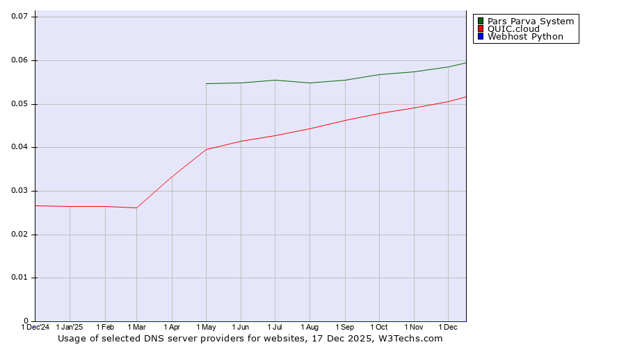 TechnologiesContent ManagementServer-side Languages Client-side Languages JavaScript Libraries CSS Frameworks Web Servers Web Panels Operating Systems Web Hosting Data Centers Reverse Proxies DNS Servers Email Servers SSL Certificate Authorities Content Delivery Traffic Analysis Tools Advertising Networks Tag Managers Social Widgets Site Elements Structured Data Markup Languages Character Encodings Image File Formats Top Level Domains Server Locations Content Languages | Technologies > DNS Servers > Technology usage comparison Comparison of the usage statistics of Pars Parva System vs. QUIC.cloud vs. Webhost Python for websitesThis report shows the usage statistics of Pars Parva System vs. QUIC.cloud vs. Webhost Python as DNS server provider on the web. See technologies overview for explanations on the methodologies used in the surveys. Our reports are updated daily. UsageThis diagram shows the percentages of websites using the selected technologies. How to read the diagram: