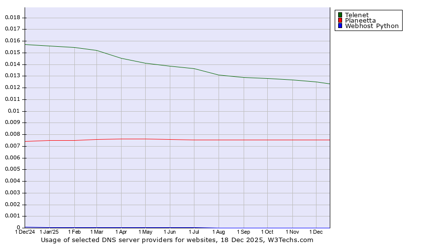TechnologiesContent ManagementServer-side Languages Client-side Languages JavaScript Libraries CSS Frameworks Web Servers Web Panels Operating Systems Web Hosting Data Centers Reverse Proxies DNS Servers Email Servers SSL Certificate Authorities Content Delivery Traffic Analysis Tools Advertising Networks Tag Managers Social Widgets Site Elements Structured Data Markup Languages Character Encodings Image File Formats Top Level Domains Server Locations Content Languages | Technologies > DNS Servers > Technology usage comparison Comparison of the usage statistics of Telenet vs. Planeetta vs. Webhost Python for websitesThis report shows the usage statistics of Telenet vs. Planeetta vs. Webhost Python as DNS server provider on the web. See technologies overview for explanations on the methodologies used in the surveys. Our reports are updated daily. UsageThis diagram shows the percentages of websites using the selected technologies. How to read the diagram: