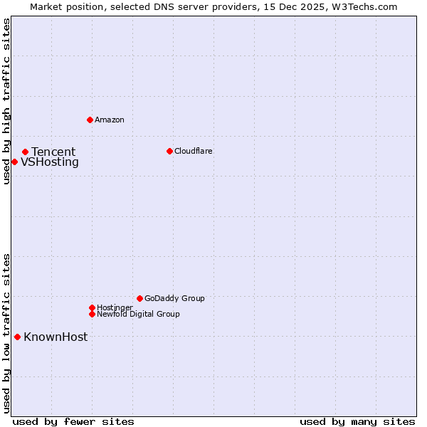 TechnologiesContent ManagementServer-side Languages Client-side Languages JavaScript Libraries CSS Frameworks Web Servers Web Panels Operating Systems Web Hosting Data Centers Reverse Proxies DNS Servers Email Servers SSL Certificate Authorities Content Delivery Traffic Analysis Tools Advertising Networks Tag Managers Social Widgets Site Elements Structured Data Markup Languages Character Encodings Image File Formats Top Level Domains Server Locations Content Languages | Technologies > DNS Servers > Technology usage comparison Comparison of the usage statistics of Tencent vs. KnownHost vs. VSHosting for websitesThis report shows the usage statistics of Tencent vs. KnownHost vs. VSHosting as DNS server provider on the web. See technologies overview for explanations on the methodologies used in the surveys. Our reports are updated daily. UsageThis diagram shows the percentages of websites using the selected technologies. How to read the diagram: