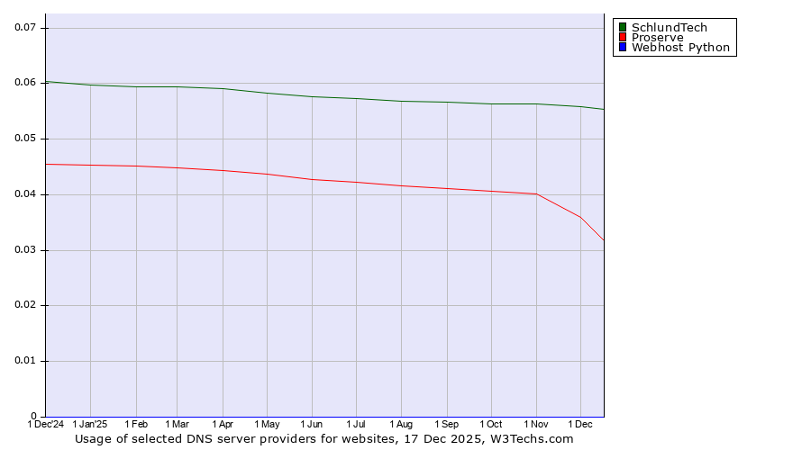 TechnologiesContent ManagementServer-side Languages Client-side Languages JavaScript Libraries CSS Frameworks Web Servers Web Panels Operating Systems Web Hosting Data Centers Reverse Proxies DNS Servers Email Servers SSL Certificate Authorities Content Delivery Traffic Analysis Tools Advertising Networks Tag Managers Social Widgets Site Elements Structured Data Markup Languages Character Encodings Image File Formats Top Level Domains Server Locations Content Languages | Technologies > DNS Servers > Technology usage comparison Comparison of the usage statistics of SchlundTech vs. Proserve vs. Webhost Python for websitesThis report shows the usage statistics of SchlundTech vs. Proserve vs. Webhost Python as DNS server provider on the web. See technologies overview for explanations on the methodologies used in the surveys. Our reports are updated daily. UsageThis diagram shows the percentages of websites using the selected technologies. How to read the diagram: