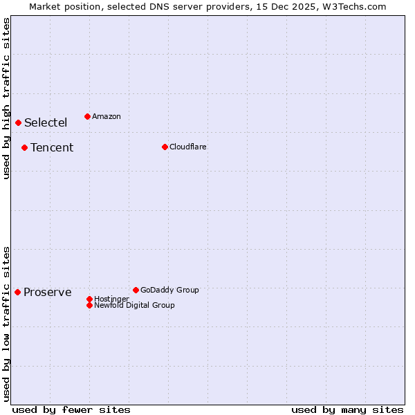 TechnologiesContent ManagementServer-side Languages Client-side Languages JavaScript Libraries CSS Frameworks Web Servers Web Panels Operating Systems Web Hosting Data Centers Reverse Proxies DNS Servers Email Servers SSL Certificate Authorities Content Delivery Traffic Analysis Tools Advertising Networks Tag Managers Social Widgets Site Elements Structured Data Markup Languages Character Encodings Image File Formats Top Level Domains Server Locations Content Languages | Technologies > DNS Servers > Technology usage comparison Comparison of the usage statistics of Tencent vs. Selectel vs. Proserve for websitesThis report shows the usage statistics of Tencent vs. Selectel vs. Proserve as DNS server provider on the web. See technologies overview for explanations on the methodologies used in the surveys. Our reports are updated daily. UsageThis diagram shows the percentages of websites using the selected technologies. How to read the diagram: