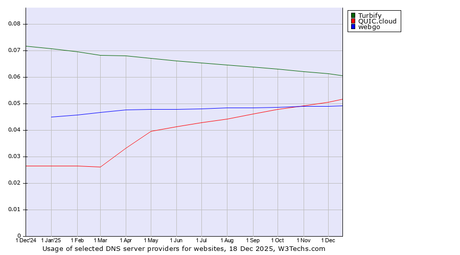 TechnologiesContent ManagementServer-side Languages Client-side Languages JavaScript Libraries CSS Frameworks Web Servers Web Panels Operating Systems Web Hosting Data Centers Reverse Proxies DNS Servers Email Servers SSL Certificate Authorities Content Delivery Traffic Analysis Tools Advertising Networks Tag Managers Social Widgets Site Elements Structured Data Markup Languages Character Encodings Image File Formats Top Level Domains Server Locations Content Languages | Technologies > DNS Servers > Technology usage comparison Comparison of the usage statistics of Turbify vs. QUIC.cloud vs. webgo for websitesThis report shows the usage statistics of Turbify vs. QUIC.cloud vs. webgo as DNS server provider on the web. See technologies overview for explanations on the methodologies used in the surveys. Our reports are updated daily. UsageThis diagram shows the percentages of websites using the selected technologies. How to read the diagram: