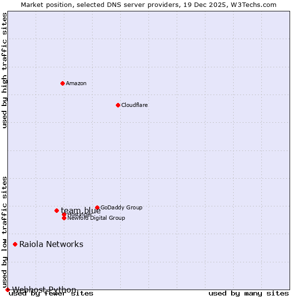TechnologiesContent ManagementServer-side Languages Client-side Languages JavaScript Libraries CSS Frameworks Web Servers Web Panels Operating Systems Web Hosting Data Centers Reverse Proxies DNS Servers Email Servers SSL Certificate Authorities Content Delivery Traffic Analysis Tools Advertising Networks Tag Managers Social Widgets Site Elements Structured Data Markup Languages Character Encodings Image File Formats Top Level Domains Server Locations Content Languages | Technologies > DNS Servers > Technology usage comparison Comparison of the usage statistics of team.blue vs. Raiola Networks vs. Webhost Python for websitesThis report shows the usage statistics of team.blue vs. Raiola Networks vs. Webhost Python as DNS server provider on the web. See technologies overview for explanations on the methodologies used in the surveys. Our reports are updated daily. UsageThis diagram shows the percentages of websites using the selected technologies. How to read the diagram:
