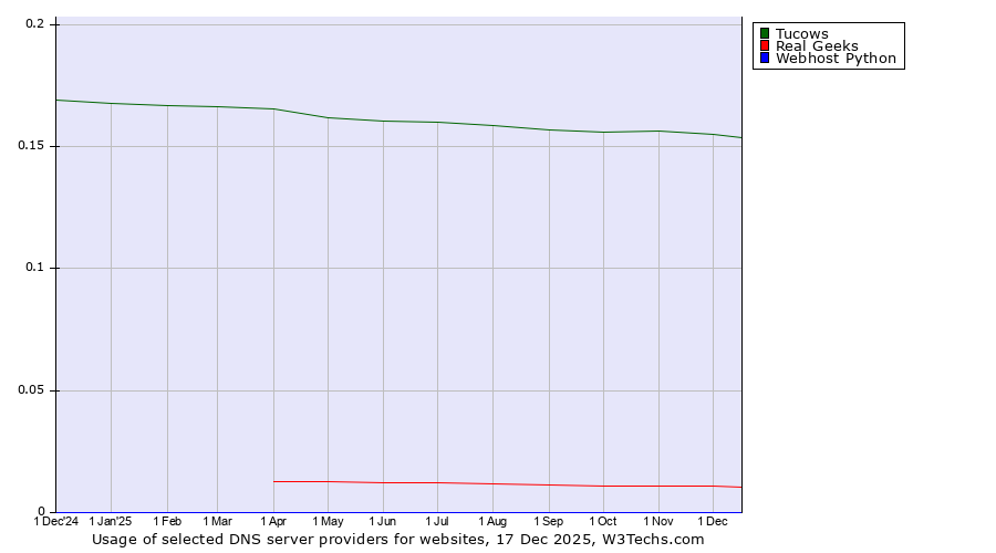 TechnologiesContent ManagementServer-side Languages Client-side Languages JavaScript Libraries CSS Frameworks Web Servers Web Panels Operating Systems Web Hosting Data Centers Reverse Proxies DNS Servers Email Servers SSL Certificate Authorities Content Delivery Traffic Analysis Tools Advertising Networks Tag Managers Social Widgets Site Elements Structured Data Markup Languages Character Encodings Image File Formats Top Level Domains Server Locations Content Languages | Technologies > DNS Servers > Technology usage comparison Comparison of the usage statistics of Tucows vs. Real Geeks vs. Webhost Python for websitesThis report shows the usage statistics of Tucows vs. Real Geeks vs. Webhost Python as DNS server provider on the web. See technologies overview for explanations on the methodologies used in the surveys. Our reports are updated daily. UsageThis diagram shows the percentages of websites using the selected technologies. How to read the diagram: