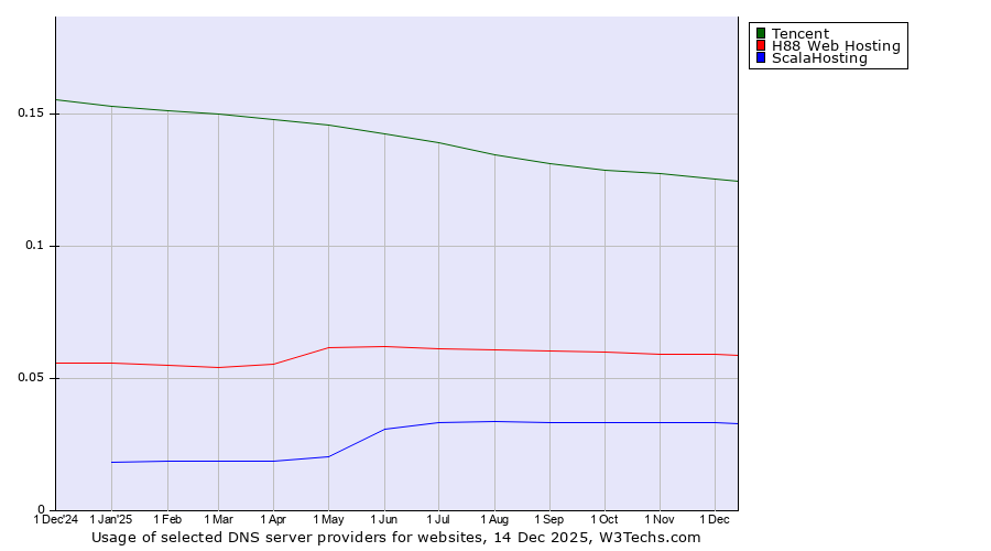 TechnologiesContent ManagementServer-side Languages Client-side Languages JavaScript Libraries CSS Frameworks Web Servers Web Panels Operating Systems Web Hosting Data Centers Reverse Proxies DNS Servers Email Servers SSL Certificate Authorities Content Delivery Traffic Analysis Tools Advertising Networks Tag Managers Social Widgets Site Elements Structured Data Markup Languages Character Encodings Image File Formats Top Level Domains Server Locations Content Languages | Technologies > DNS Servers > Technology usage comparison Comparison of the usage statistics of Tencent vs. H88 Web Hosting vs. ScalaHosting for websitesThis report shows the usage statistics of Tencent vs. H88 Web Hosting vs. ScalaHosting as DNS server provider on the web. See technologies overview for explanations on the methodologies used in the surveys. Our reports are updated daily. UsageThis diagram shows the percentages of websites using the selected technologies. How to read the diagram: