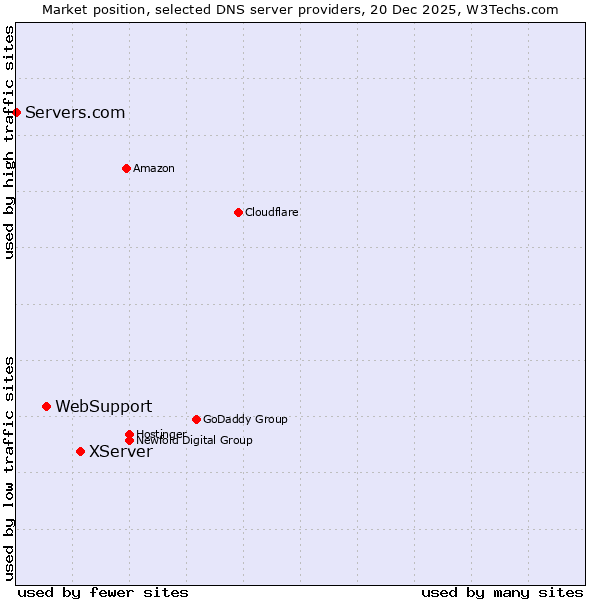 TechnologiesContent ManagementServer-side Languages Client-side Languages JavaScript Libraries CSS Frameworks Web Servers Web Panels Operating Systems Web Hosting Data Centers Reverse Proxies DNS Servers Email Servers SSL Certificate Authorities Content Delivery Traffic Analysis Tools Advertising Networks Tag Managers Social Widgets Site Elements Structured Data Markup Languages Character Encodings Image File Formats Top Level Domains Server Locations Content Languages | Technologies > DNS Servers > Technology usage comparison Comparison of the usage statistics of XServer vs. WebSupport vs. Servers.com for websitesThis report shows the usage statistics of XServer vs. WebSupport vs. Servers.com as DNS server provider on the web. See technologies overview for explanations on the methodologies used in the surveys. Our reports are updated daily. UsageThis diagram shows the percentages of websites using the selected technologies. How to read the diagram: